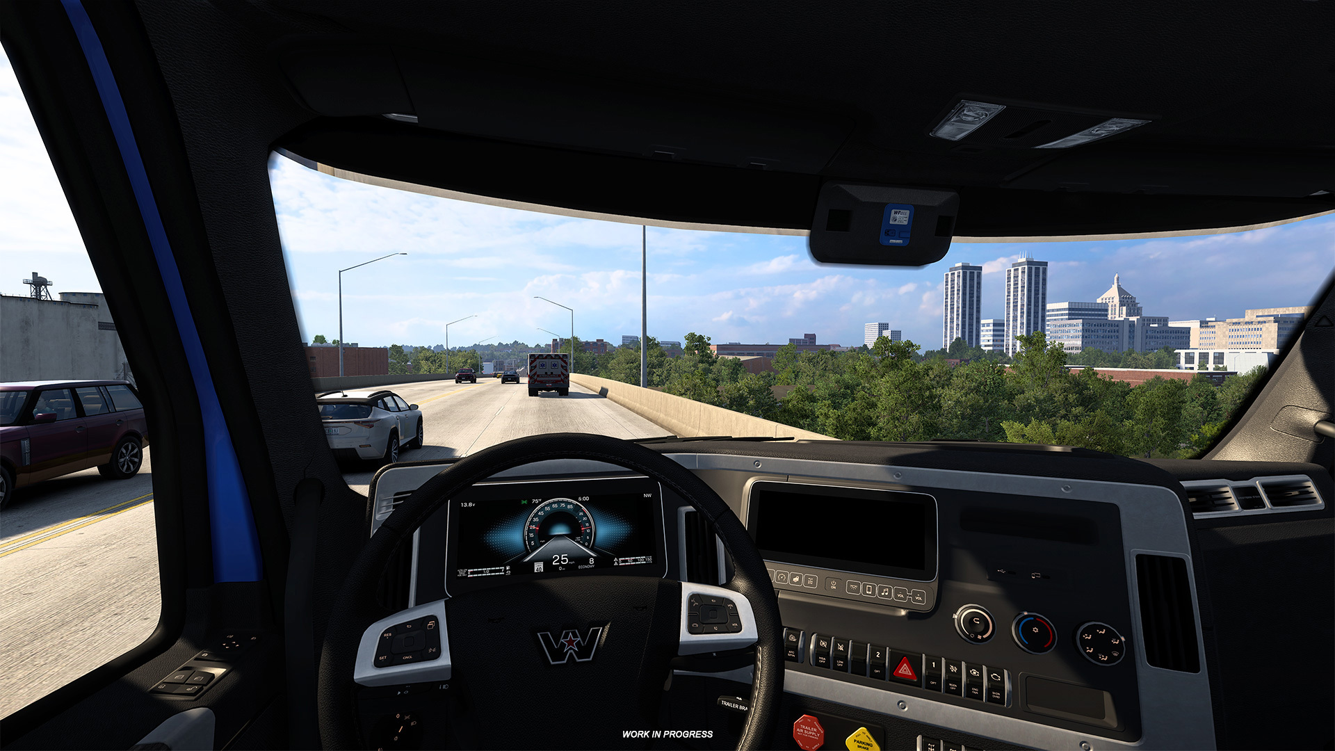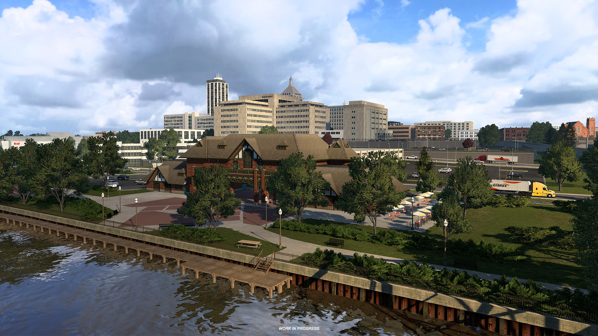 Peoria’s connection to the Illinois River runs deep, from its early days as a trading post to its modern role in logistics. Our rendition of the city includes a custom river port depot, allowing players to experience this important aspect of local industry firsthand. With its sweeping waterfront views, the river also delivers some of the most memorable driving moments in Peoria.