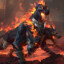 His arms and legs are stained with blood, coating his entire arms and hands up to his elbows. Likewise, his legs and feet-paws are coated in blood up to his knees.