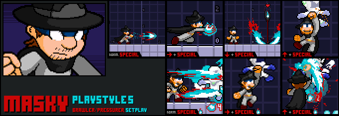 A shadow of fury, a force of vengeance. Masky, the Masked Ranger or Trooper, is here to bring raging justice to the battlefield! Born from the sheer intensity of G.B.A's wrath, Masky is an unpredictable brawler-type fighter who thrives on momentum, power, and relentless aggression.