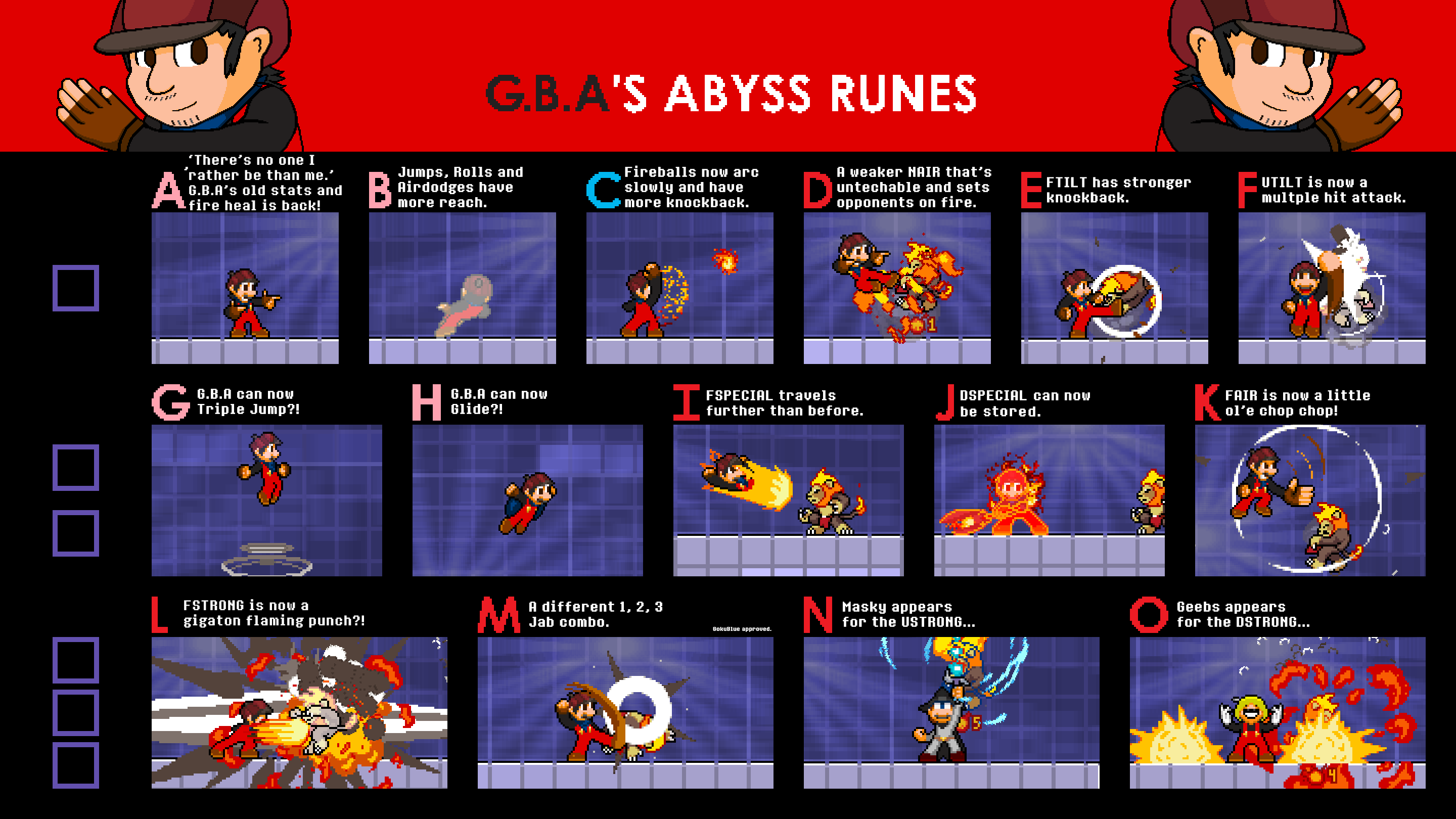 G.B.A will pull out his handy-dandy weapon of choice, the Flame Sceptre, to smash anyone unfortunate enough to be near him. But, fear not, if that person is far away instead, they will soon be hit by a fiery speeding flame. Also, the attack can be charged like a strong/smash attack that leads to a powerful explosive finish!